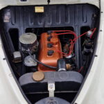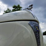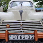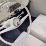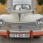 A felújított példány már első ránézésre is különleges. Kétszínű fényezése korhű, mégis friss hatást kelt, különösen a nehezen beszerezhető, utólag felszerelt zöld napellenzővel kiegészítve. Ez az elem nemcsak esztétikai, hanem funkcionális szempontból is érdekes: minimálisan billenthető, így vezetés közben is kényelmet biztosít, ha Nappal szemben suhan a veterán Peugeot.